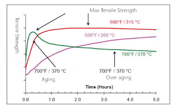 從圖中可以看出,在550°F(290°C)的低溫下,C17200的強度緩慢增加,直到大約30小時后才達到峰值。在600°F(315°C)的標準溫度下3個小時,C17200的強度變化不大。在700°F(370°C)下,強度在30分鐘內達到峰值,并幾乎立即下降。簡而言之,隨著時效溫度的升高,達到峰值強度所需的時間和可用的最大強度都會減少。